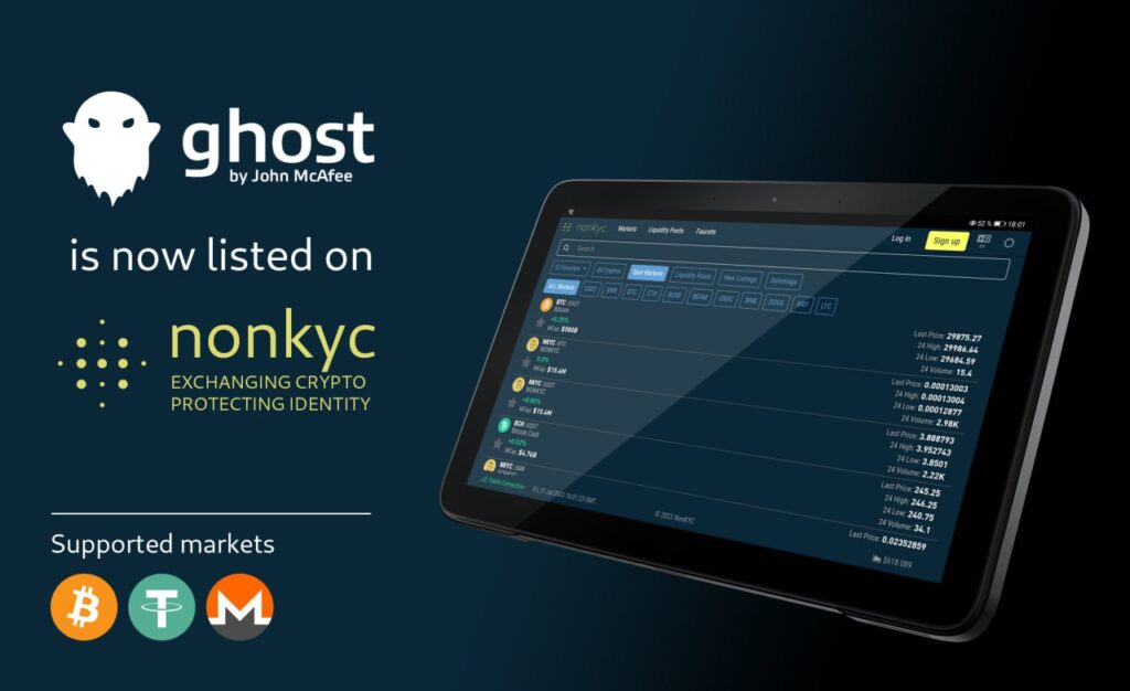 Ghost is now listed on NonKyc Exchange. NonKYC offers a wide range of services from markets to liquidity pools. Available pairs BTC-ETH-MATIC-USDT-XMR