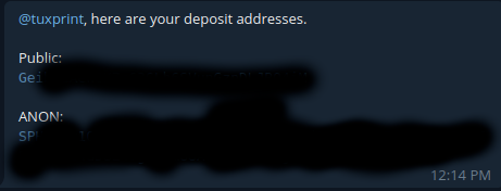 To begin, send the bot the /deposit command. This will show you your Public and Anon deposit addresses.