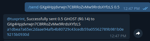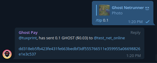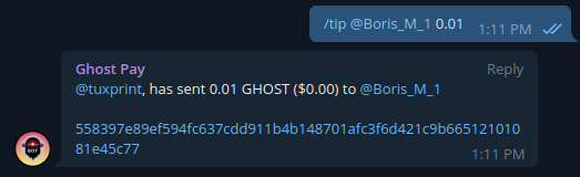Since bots on Telegram can not message a user first, make sure to tell the user you tipped to visit Ghost Pay Bot so they can access their funds.