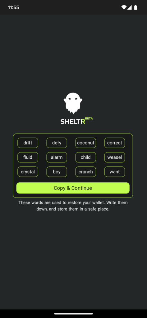 On this screen you will be presented with your mnemonic seed words. It is very important to keep these words safe as they are how you recover your wallet.