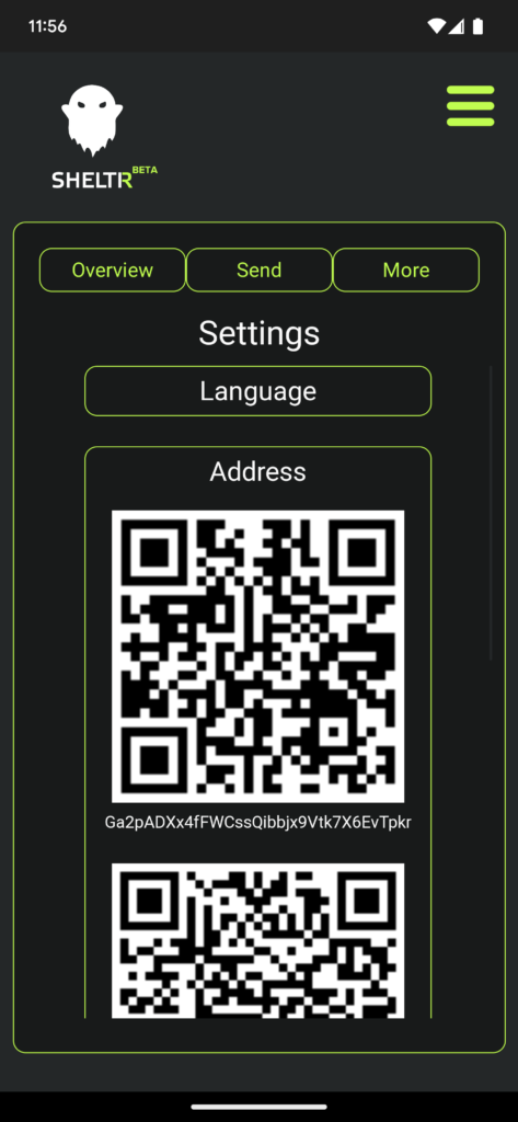 Load your SHELTR wallet. Once loaded, tap the 3 lines in the corner to enter the Settings menu. Once in the Settings menu, tap the Address option.