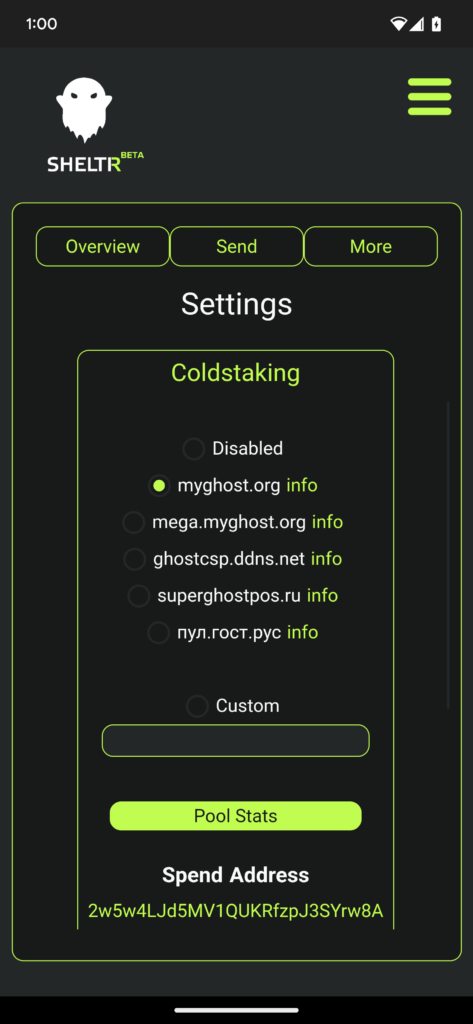 Once in the settings menu, select ‘Coldstaking’ to see the options. From here simply select the pool you wish to use.