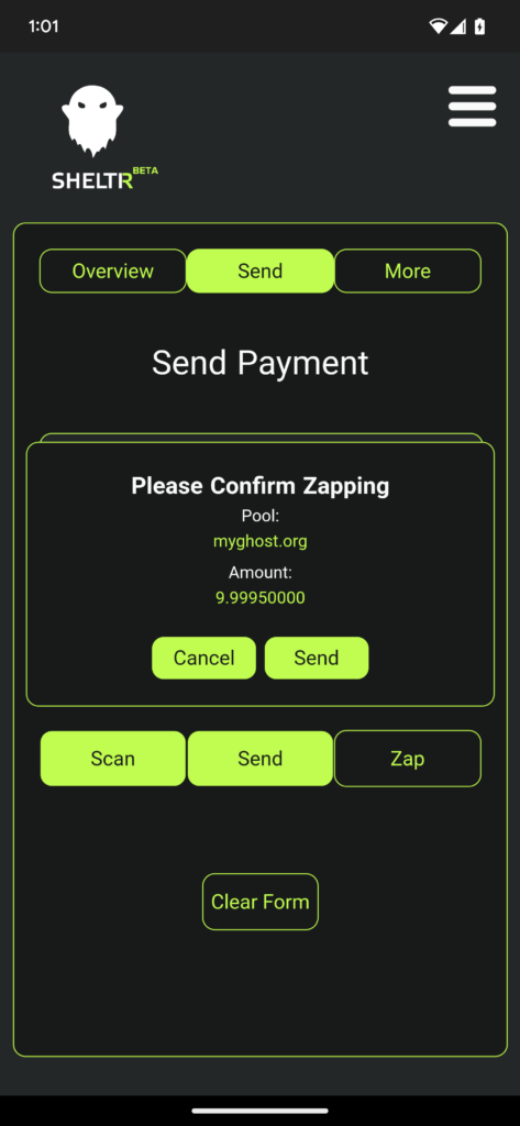Now navigate to the ‘Send’ tab. On the send tab, enter your password into the form, then tap the ‘Zap’ button.