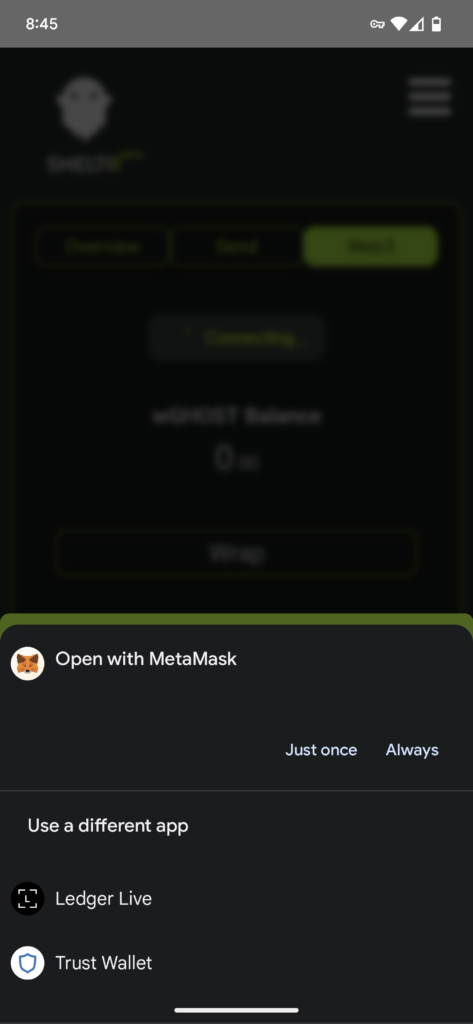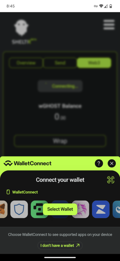 To begin using wGHOST with SHELTR, you will first need to connect your web3 wallet to the SHELTR application.