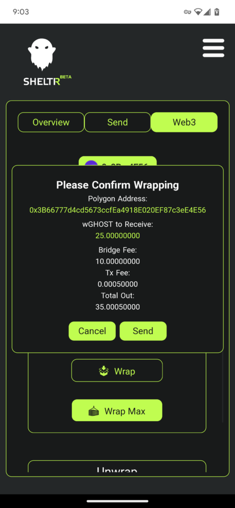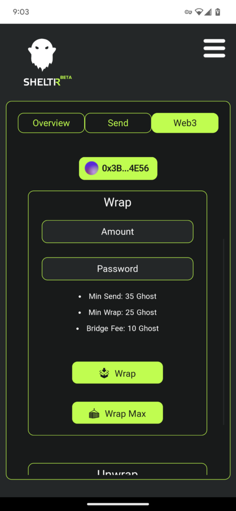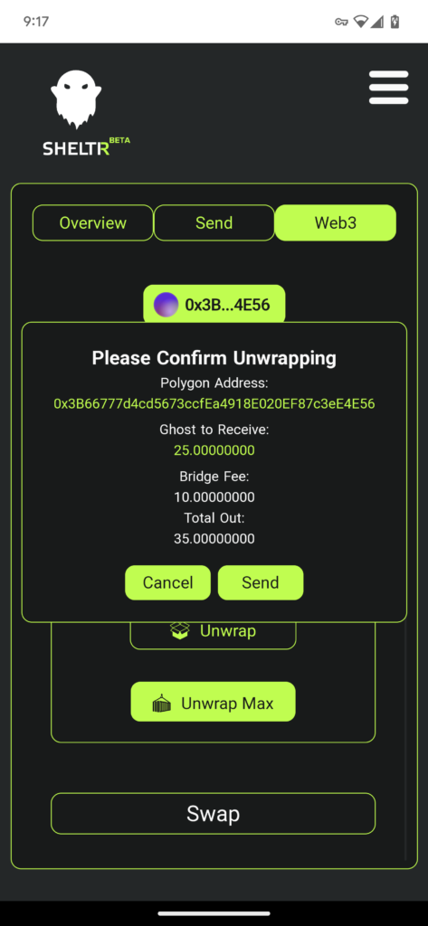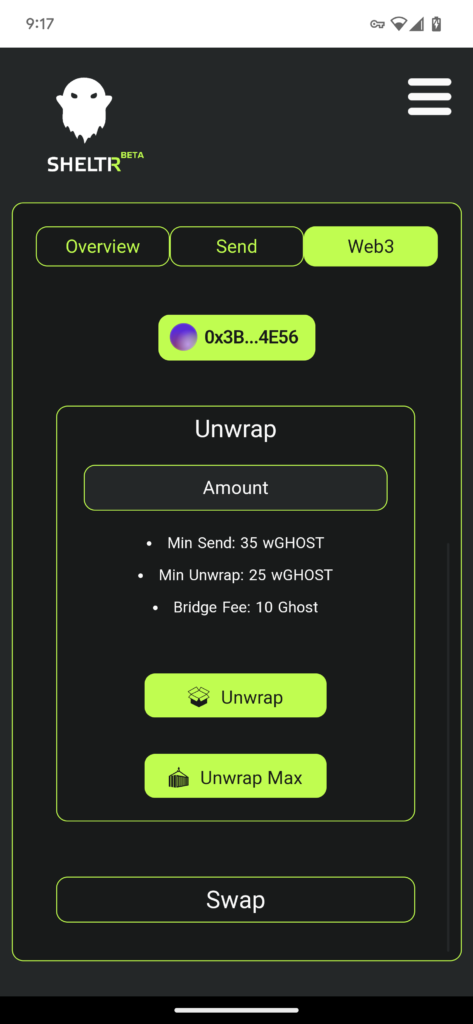 Navigate the the web3 tab in your SHELTR wallet and select the Unwrap option.